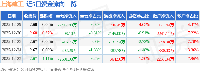 证券之星消息,截至2025年12月29日收盘,上海建工(600170)报收于2.68元,上涨0.0%,换手率1.12%,成交量99.82万手,成交额2.68亿元。