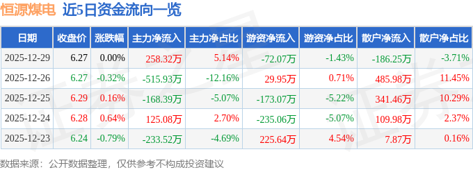 证券之星消息,截至2025年12月29日收盘,恒源煤电(600971)报收于6.27元,上涨0.0%,换手率0.67%,成交量8.0万手,成交额5026.61万元。