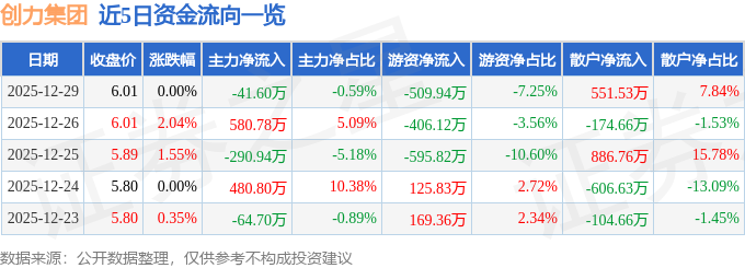 证券之星消息,截至2025年12月29日收盘,创力集团(603012)报收于6.01元,上涨0.0%,换手率1.81%,成交量11.67万手,成交额7030.76万元。