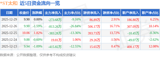 证券之星消息,截至2025年12月29日收盘,*ST太和(605081)报收于9.9元,上涨0.0%,换手率2.71%,成交量3.07万手,成交额2986.4万元。