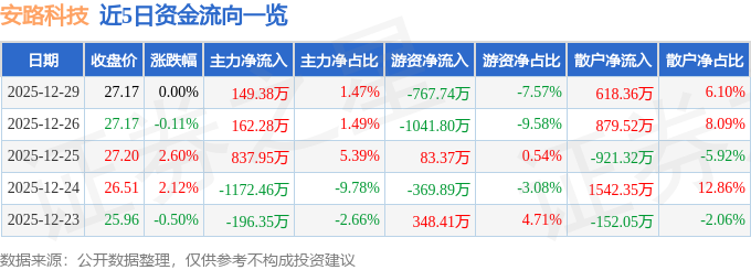 证券之星消息,截至2025年12月29日收盘,安路科技(688107)报收于27.17元,上涨0.0%,换手率0.93%,成交量3.73万手,成交额1.01亿元。