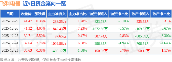 证券之星消息,截至2025年12月29日收盘,飞科电器(603868)报收于41.47元,上涨0.36%,换手率0.9%,成交量3.92万手,成交额1.62亿元。