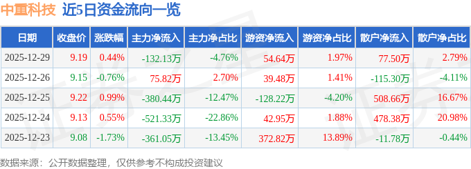 证券之星消息,截至2025年12月29日收盘,中重科技(603135)报收于9.19元,上涨0.44%,换手率1.2%,成交量3.03万手,成交额2773.4万元。