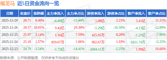 证券之星消息,截至2025年12月29日收盘,福龙马(603686)报收于28.71元,上涨0.49%,换手率39.01%,成交量162.06万手,成交额48.25亿元。