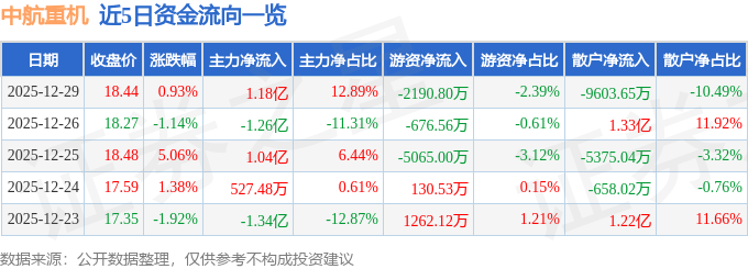 证券之星消息,截至2025年12月29日收盘,中航重机(600765)报收于18.44元,上涨0.93%,换手率3.22%,成交量49.94万手,成交额9.15亿元。