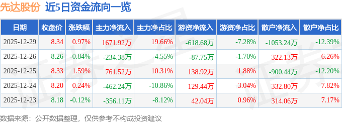 证券之星消息,截至2025年12月29日收盘,先达股份(603086)报收于8.34元,上涨0.97%,换手率2.34%,成交量10.19万手,成交额8503.28万元。