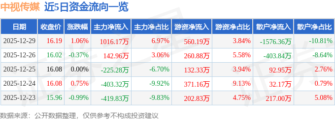 证券之星消息,截至2025年12月29日收盘,中视传媒(600088)报收于16.19元,上涨1.06%,换手率2.28%,成交量9.05万手,成交额1.46亿元。