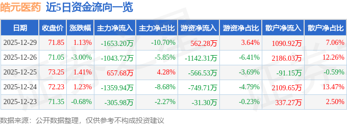 证券之星消息,截至2025年12月29日收盘,皓元医药(688131)报收于71.85元,上涨1.13%,换手率1.01%,成交量2.15万手,成交额1.55亿元。