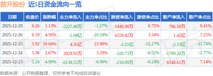 证券之星消息,截至2025年12月29日收盘,首开股份(600376)报收于6.26元,上涨1.13%,换手率11.77%,成交量303.72万手,成交额19.11亿元。