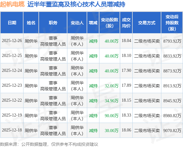起帆电缆近半年内的董监高及核心技术人员增减持详情如下: