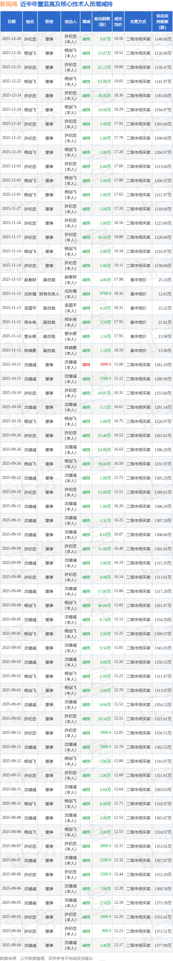 新凤鸣近半年内的董监高及核心技术人员增减持详情如下: