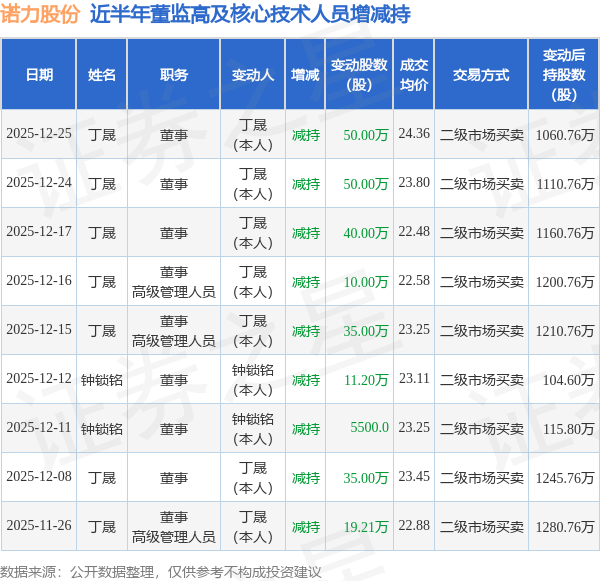 证券之星消息,根据12月29日市场公开信息、上市公司公告及交易所披露数据整理,诺力股份(603611)最新董监高及相关人员股份变动情况:2025年12月24日至2025年12月25日公司董事丁晟共减持公司股份100.0万股,占公司总股本为0.3882%。变动期间公司股价上涨4.81%,12月25日当日收盘报24.42元。