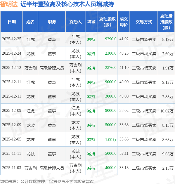 智明达近半年内的董监高及核心技术人员增减持详情如下: