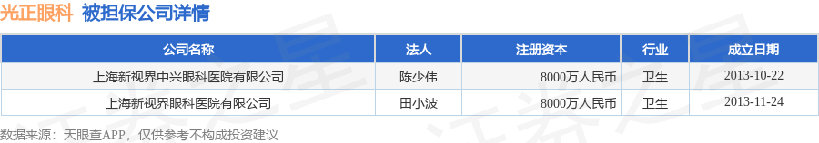 光正眼科12月26日披露2笔对外担保,被担保公司2家。对外担保明细如下表: