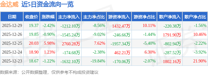 证券之星消息,截至2025年12月29日收盘,金达威(002626)报收于19.37元,下跌2.42%,换手率1.19%,成交量7.27万手,成交额1.42亿元。