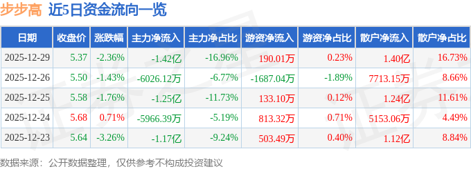 证券之星消息,截至2025年12月29日收盘,步步高(002251)报收于5.37元,下跌2.36%,换手率7.18%,成交量154.49万手,成交额8.37亿元。