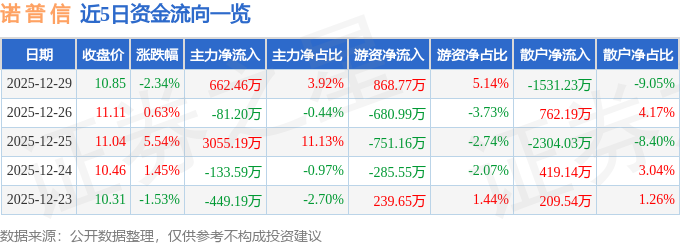 证券之星消息,截至2025年12月29日收盘,诺 普 信(002215)报收于10.85元,下跌2.34%,换手率1.98%,成交量15.53万手,成交额1.69亿元。