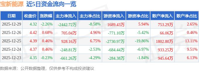 证券之星消息,截至2025年12月29日收盘,宝新能源(000690)报收于4.32元,下跌2.26%,换手率3.01%,成交量65.38万手,成交额2.85亿元。