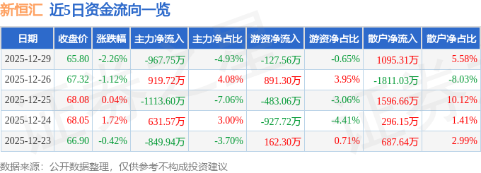 证券之星消息,截至2025年12月29日收盘,新恒汇(301678)报收于65.8元,下跌2.26%,换手率6.17%,成交量2.96万手,成交额1.96亿元。