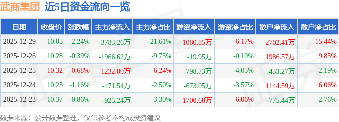 证券之星消息,截至2025年12月29日收盘,武商集团(000501)报收于10.05元,下跌2.24%,换手率2.25%,成交量17.25万手,成交额1.75亿元。