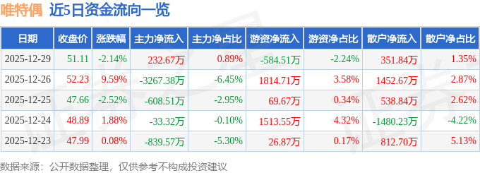证券之星消息,截至2025年12月29日收盘,唯特偶(301319)报收于51.11元,下跌2.14%,换手率5.46%,成交量5.1万手,成交额2.6亿元。