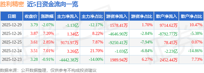 证券之星消息,截至2025年12月29日收盘,胜利精密(002426)报收于3.79元,下跌2.07%,换手率7.2%,成交量245.04万手,成交额9.28亿元。