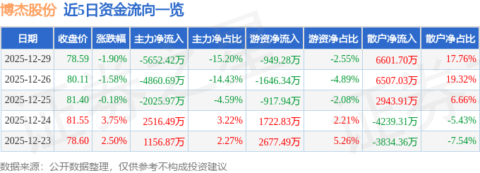 证券之星消息,截至2025年12月29日收盘,博杰股份(002975)报收于78.59元,下跌1.9%,换手率4.46%,成交量4.72万手,成交额3.72亿元。