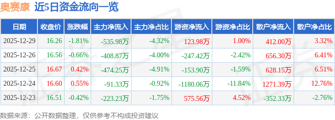 证券之星消息,截至2025年12月29日收盘,奥赛康(002755)报收于16.26元,下跌1.81%,换手率0.82%,成交量7.59万手,成交额1.24亿元。
