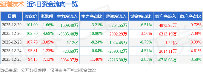 证券之星消息,截至2025年12月29日收盘,强瑞技术(301128)报收于101.0元,下跌1.66%,换手率5.58%,成交量4.93万手,成交额5.01亿元。