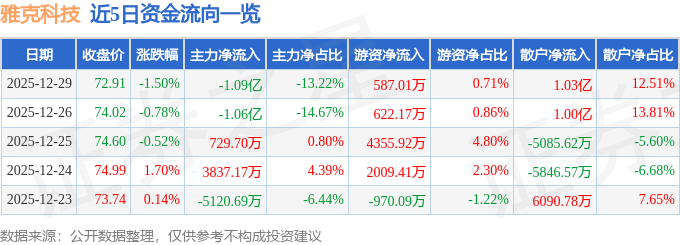 证券之星消息,截至2025年12月29日收盘,雅克科技(002409)报收于72.91元,下跌1.5%,换手率3.52%,成交量11.23万手,成交额8.23亿元。