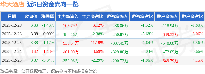 证券之星消息,截至2025年12月29日收盘,华天酒店(000428)报收于3.33元,下跌1.48%,换手率1.94%,成交量19.78万手,成交额6598.64万元。