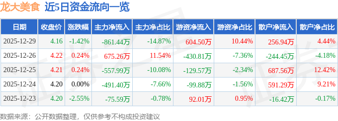 证券之星消息,截至2025年12月29日收盘,龙大美食(002726)报收于4.16元,下跌1.42%,换手率1.29%,成交量13.84万手,成交额5792.86万元。
