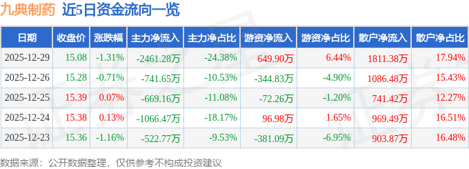 证券之星消息,截至2025年12月29日收盘,九典制药(300705)报收于15.08元,下跌1.31%,换手率1.8%,成交量6.67万手,成交额1.01亿元。