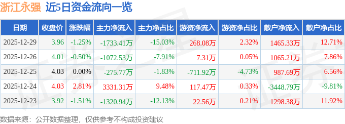 证券之星消息,截至2025年12月29日收盘,浙江永强(002489)报收于3.96元,下跌1.25%,换手率1.52%,成交量29.05万手,成交额1.15亿元。