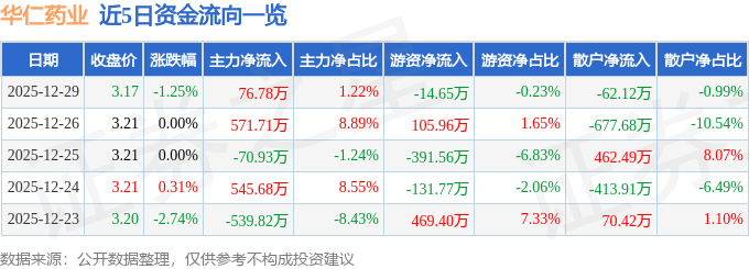证券之星消息,截至2025年12月29日收盘,华仁药业(300110)报收于3.17元,下跌1.25%,换手率1.67%,成交量19.77万手,成交额6295.82万元。