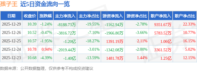 证券之星消息,截至2025年12月29日收盘,孩子王(301078)报收于10.39元,下跌1.24%,换手率3.2%,成交量40.13万手,成交额4.19亿元。