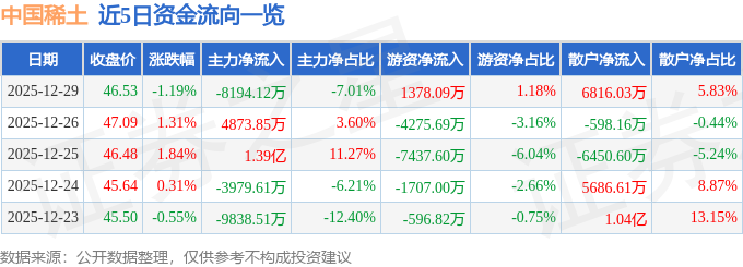 证券之星消息,截至2025年12月29日收盘,中国稀土(000831)报收于46.53元,下跌1.19%,换手率2.35%,成交量24.91万手,成交额11.69亿元。