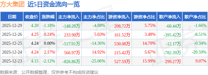 证券之星消息,截至2025年12月29日收盘,方大集团(000055)报收于4.2元,下跌1.18%,换手率1.28%,成交量8.64万手,成交额3631.25万元。