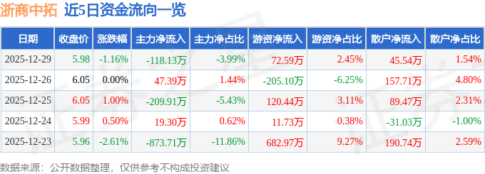 证券之星消息,截至2025年12月29日收盘,浙商中拓(000906)报收于5.98元,下跌1.16%,换手率0.7%,成交量4.93万手,成交额2959.92万元。