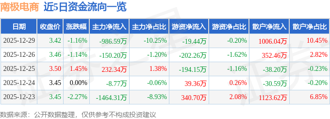 证券之星消息,截至2025年12月29日收盘,南极电商(002127)报收于3.42元,下跌1.16%,换手率1.41%,成交量28.04万手,成交额9626.1万元。