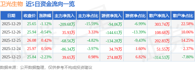证券之星消息,截至2025年12月29日收盘,卫光生物(002880)报收于25.65元,下跌1.12%,换手率0.23%,成交量5224.0手,成交额1344.89万元。
