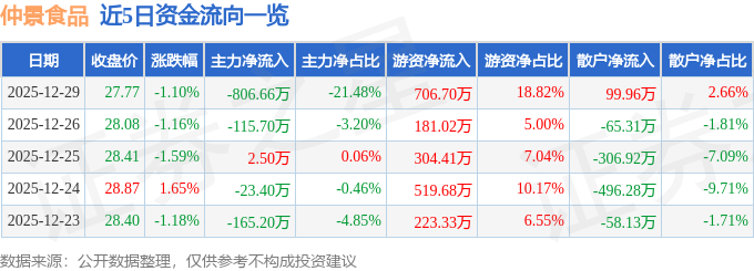 证券之星消息,截至2025年12月29日收盘,仲景食品(300908)报收于27.77元,下跌1.1%,换手率1.1%,成交量1.35万手,成交额3755.48万元。