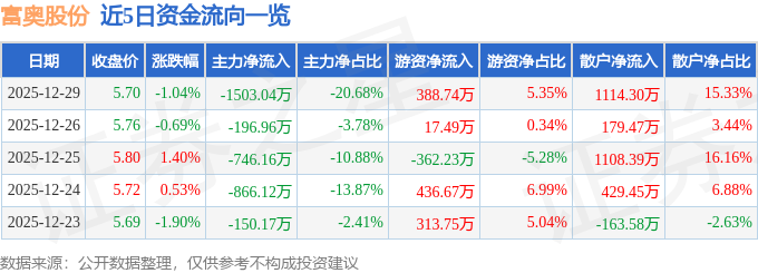 证券之星消息,截至2025年12月29日收盘,富奥股份(000030)报收于5.7元,下跌1.04%,换手率0.76%,成交量12.64万手,成交额7266.89万元。