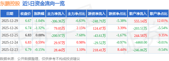 证券之星消息,截至2025年12月29日收盘,东鹏控股(003012)报收于6.67元,下跌1.04%,换手率0.6%,成交量6.91万手,成交额4621.96万元。