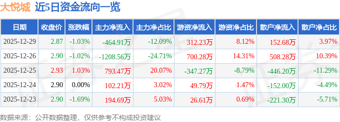 证券之星消息,截至2025年12月29日收盘,大悦城(000031)报收于2.87元,下跌1.03%,换手率0.31%,成交量13.33万手,成交额3845.82万元。