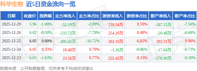 证券之星消息,截至2025年12月29日收盘,科华生物(002022)报收于5.96元,下跌1.0%,换手率0.81%,成交量4.17万手,成交额2495.14万元。