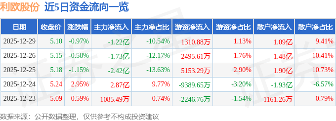 证券之星消息,截至2025年12月29日收盘,利欧股份(002131)报收于5.1元,下跌0.97%,换手率3.86%,成交量225.95万手,成交额11.6亿元。