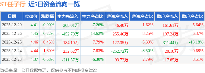 证券之星消息,截至2025年12月29日收盘,ST任子行(300311)报收于4.41元,下跌0.9%,换手率1.21%,成交量6.49万手,成交额2865.21万元。