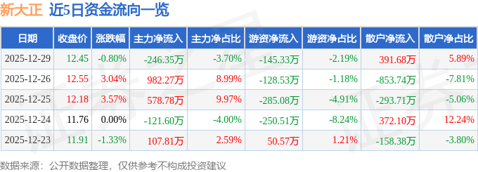 证券之星消息,截至2025年12月29日收盘,新大正(002968)报收于12.45元,下跌0.8%,换手率2.49%,成交量5.32万手,成交额6649.66万元。