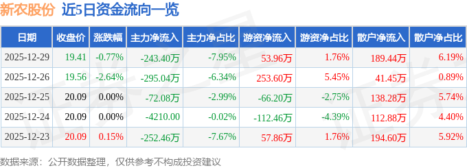 证券之星消息,截至2025年12月29日收盘,新农股份(002942)报收于19.41元,下跌0.77%,换手率1.15%,成交量1.57万手,成交额3060.55万元。